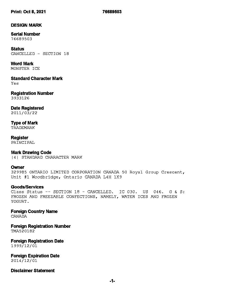 Further Registration No. 3933126 for the mark MONSTER ICE is cancelled. See the attached registration. Cancelled or expired third-party registrations have no probative value other than as evidence that the registrations were issued. See Action Temp. Servs. Inc. v. Labor Force Inc., 870 F.2d 1563, 1566, 10 USPQ2d 1307, 1309 (Fed. Cir. 1989); In re Inn at St. John’s, LLC, 126 USPQ2d 1742, 1745 (TTAB 2018), aff’d per curiam, 777 F. App’x 516, 2019 BL 343921 (Fed. Cir. 2019); TBMP §704.03(b)(1)(A).